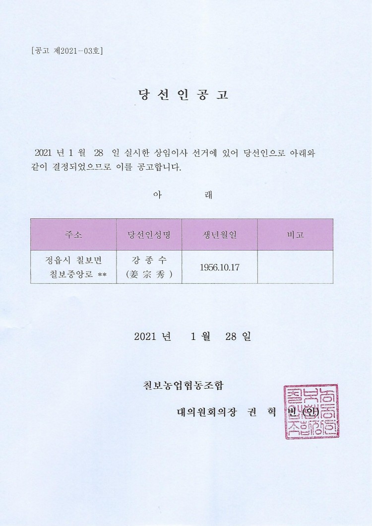 상임이사 당선인 공고 페이지 정보 작성자 칠보농협 작성일21-01-28 15:03 조회3,225회 댓글0건 관련링크 이전글 다음글 목록 본문 2021.1.28. 실시한 상임이사 선거에서붙임과 같이 당선인이 결정되었기에 공고합니다. 붙 임 : 당선인공고 1부 끝. 댓글목록 등록된 댓글이 없습니다. 이전글 다음글 목록