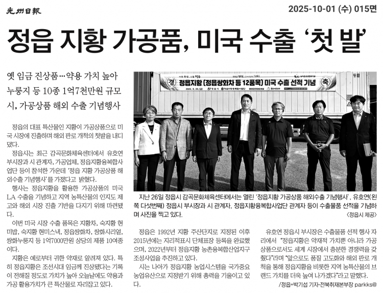 정읍 지황 가공품, 미국 수출 '첫발' 페이지 정보 작성자 칠보농협 작성일25-10-15 14:10 조회279회 댓글0건 관련링크 이전글 다음글 목록 본문 정읍시, 정읍지황 가공상품 美 LA 첫 수출...해외시장 개척 본격 댓글목록 등록된 댓글이 없습니다. 이전글 다음글 목록